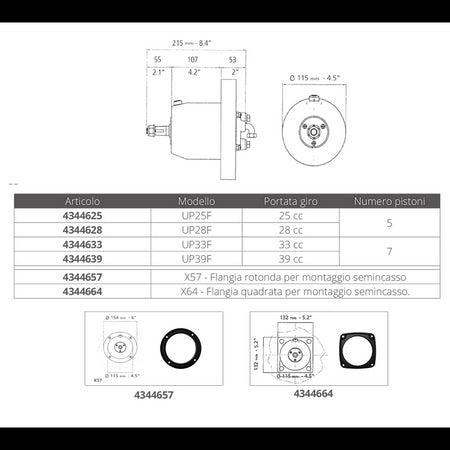 Front-mounted pump, compact structure, axial piston system, non-return valve that prevents reversibility, overpressure protection valve, 3/4 conical shaft in stainless steel, cast iron rotor for greater durability, front oil filling, prepared for 1/4 NPT fittings, for 3/8 pipe complete with elbow fittings. Weight 5 kg. Possibility of semi-recessed mounting.