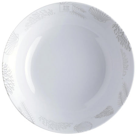 Servizio da tavola realizzato in Melamina al 100%, PBA Free. Sui toni del blu navy e beige, decorato con disegni di coralli e conchiglie. Lavabili in lavastoviglie. Le stoviglie, le tazze e i bicchieri hanno un anello antiscivolo alla base che ne impedisce lo scivolamento sul tavolo.
