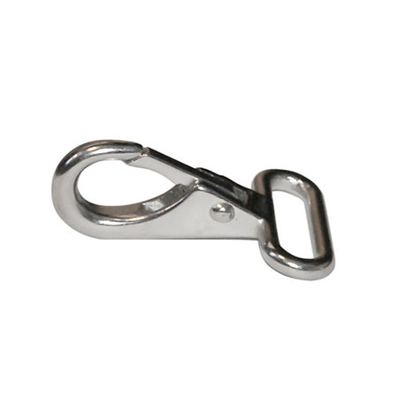 Moschettone in acciaio inox AISI 316, occhio piatto per nastro mm. 25. Ideale per tendere le capottine. Dim. mm. A=50mm. B=6mm. C=25mm.
