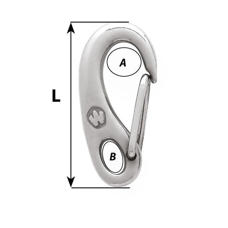 Moschettone realizzato in acciaio inox HR (grado 17.4 ph) con occhio fisso, a sgancio rapido, con apertura esterna e carichi di rottura certificati.