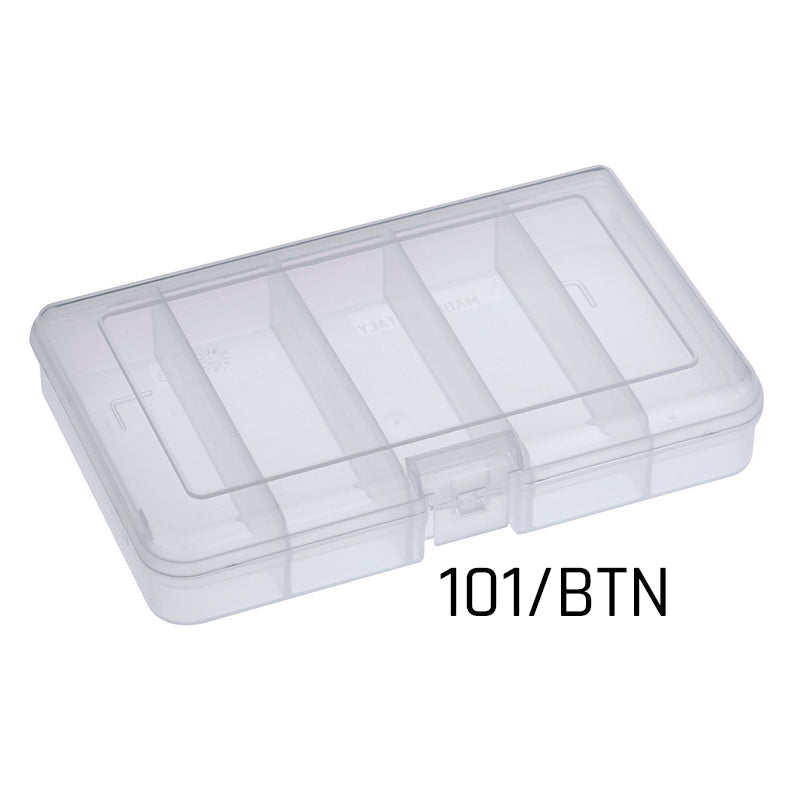 Scatola Porta Minuterie 101/BNT in plastica da pesca con misure interne 165 x 112 x 31 mm / 6.50 x 4.41 x 1.22 inch. Colore trasparente. Questa scatola porta minuterie è disponibile in diverse configurazioni: vuota, con 3, 5, 6, 10, 13 o 15 scomparti interni. Materiale: polipropilene.